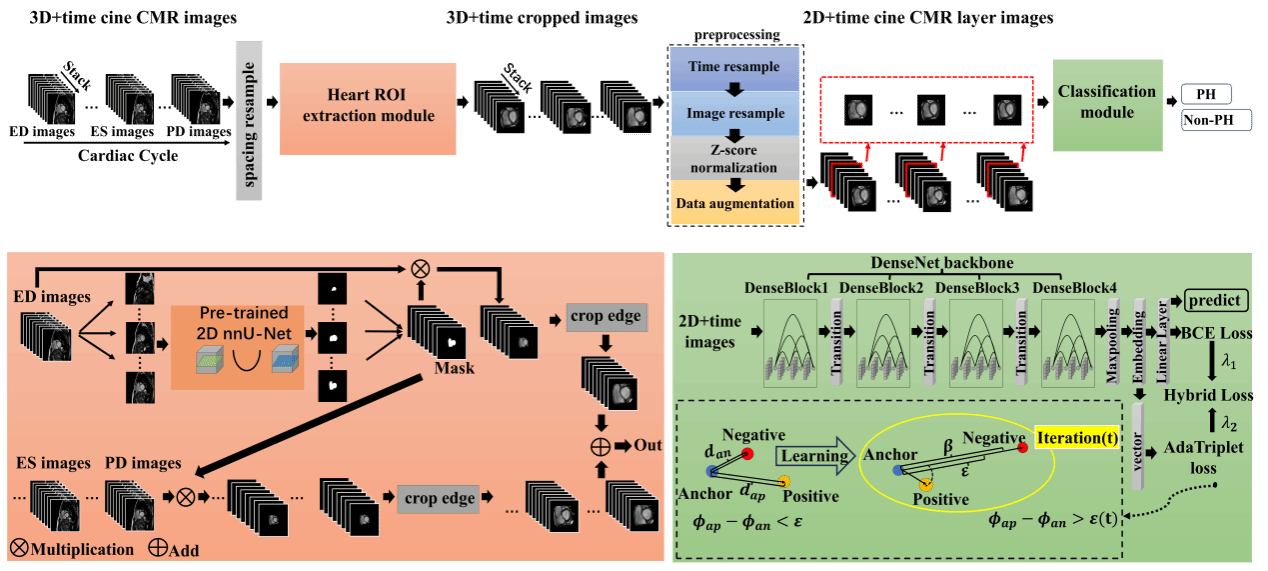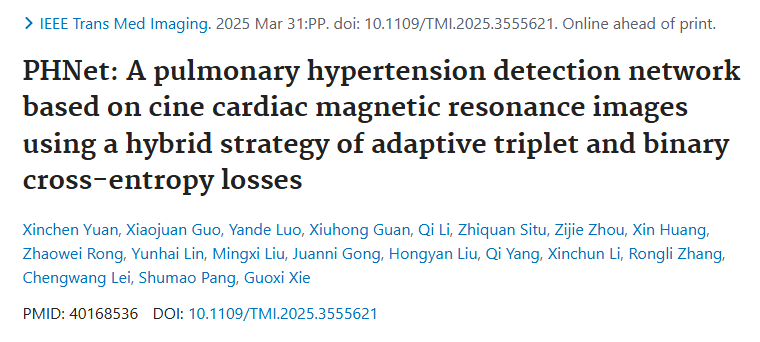 3月31日,我院谢国喜教授团队及合作者在IEEE Transactions on Medical Imaging上在线发表了基于心脏磁共振成像的肺动脉高压无创智能检测模型的研究论文PHNet: A pulmonary hypertension detection network based on cine cardiac magnetic resonance images using a hybrid strategy of adaptive triplet and binary cross-entropy losses,为临床提供了强有力的辅助诊断工具。生物医学工程学院硕士生袁心辰为论文第一作者,谢国喜教授为论文唯一通讯作者,广州医科大学为第一署名单位。