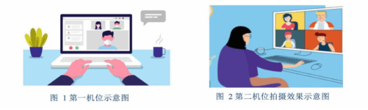 一台设备(电脑)从正面拍摄,另一台设备(手机)从考生侧后方45度拍摄,确保第一机位和第二机位分别从考生正面和侧后方完整拍摄考生全身,考官在复试过程中可以观察考生及考场周边环境。第一机位及第二机位效果图如下: